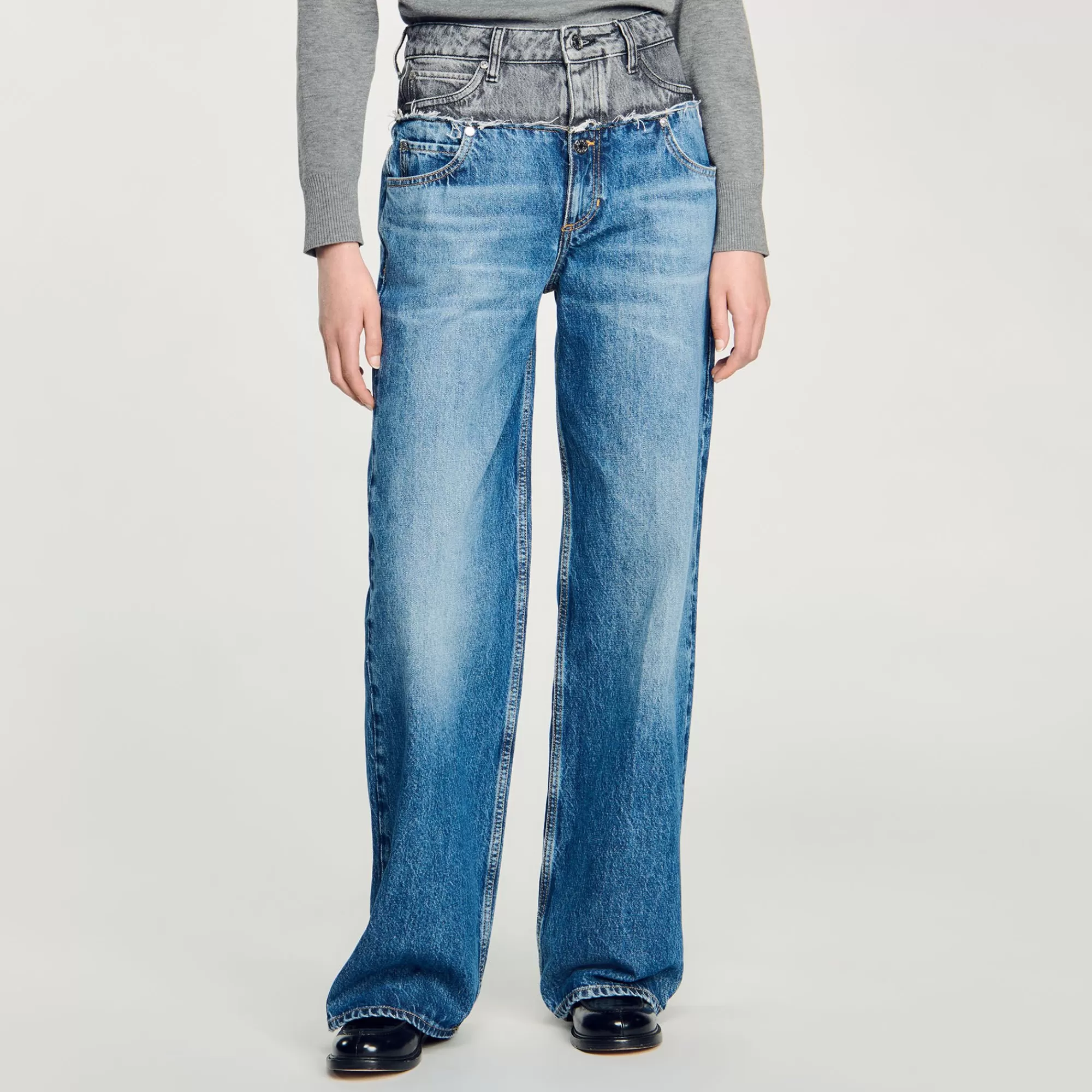 Jeans met wijde pasvorm, dubbele gerafelde tailleband met trompe-l’oeil effect, vijf zakken en riemlussen.
