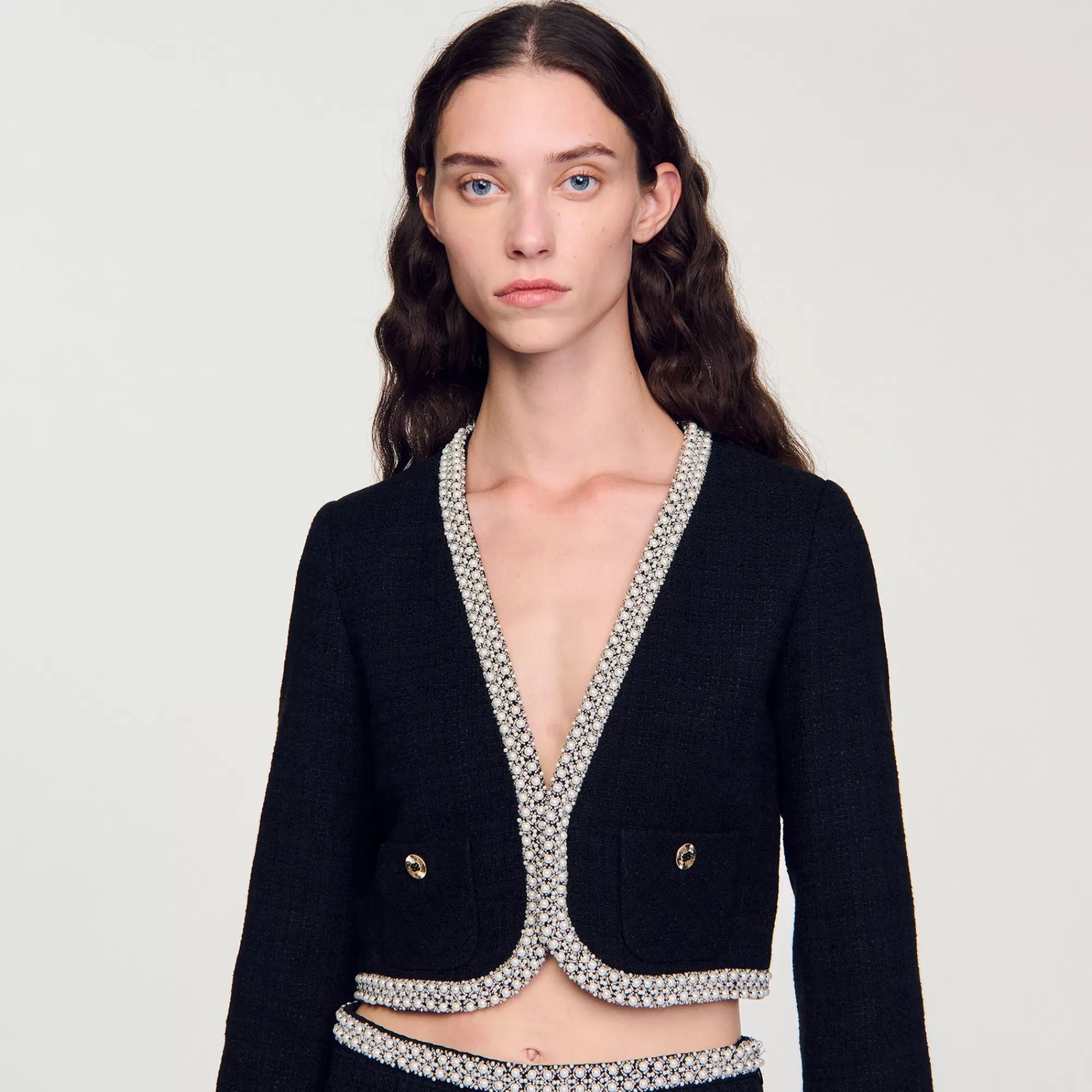 Kort tweed jasje met lange mouwen, opgestikte zakken en galons met parels.