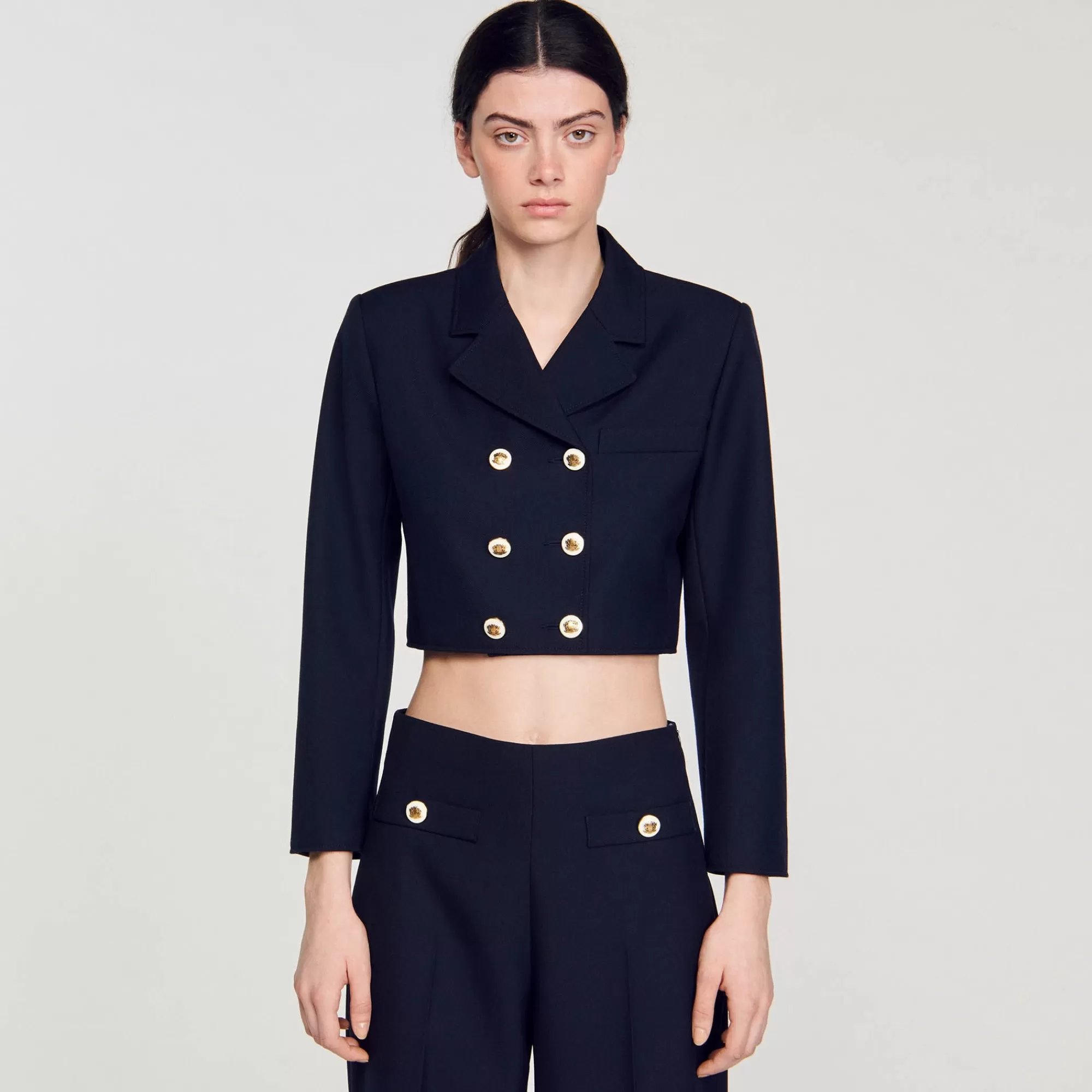 Kort vest in spencer stijl van wollen keperstof met twee rijen sierknopen, lange mouwen, epauletten en een paspelzak op de borst.