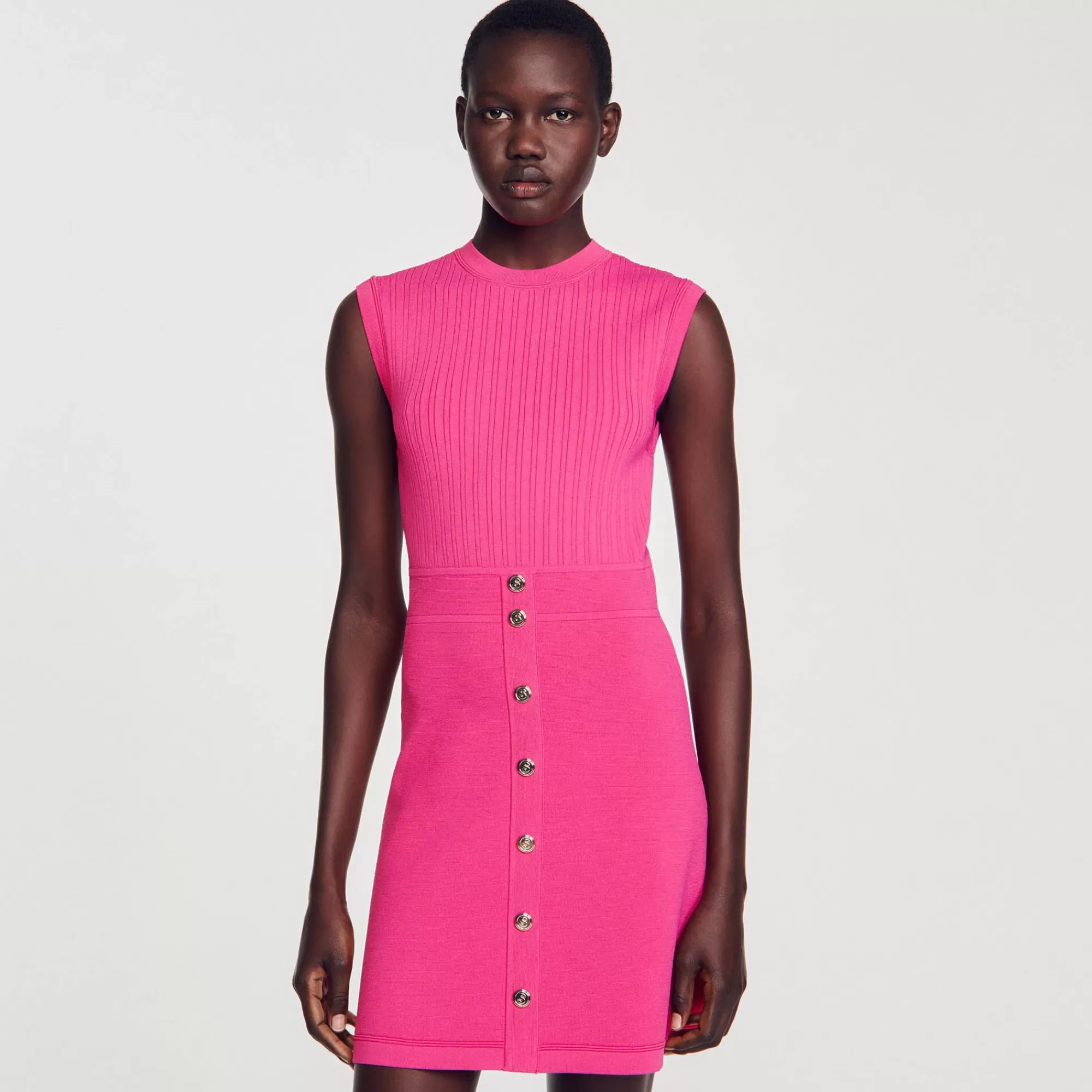 Mouwloze korte jurk van milano tricot, met lijfje van ribtricot en wijd uitlopend bij de zoom, met een ronde hals en goudkleurige knopen.