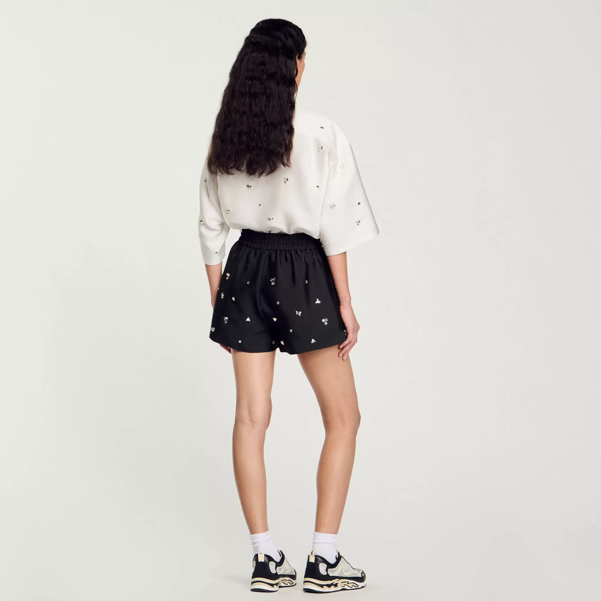 Wijd licht uitlopend short in de stijl van boxershorts met all-over stras, ceintuur met lussen en trekkoord, en steekzakken.